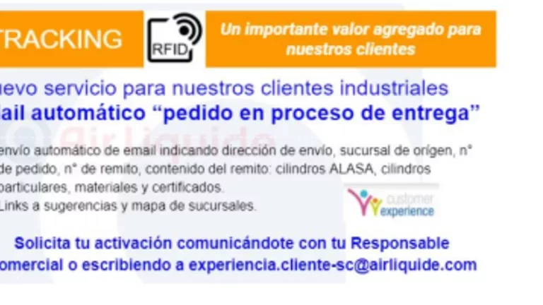 Puede solicitar la activación de este servicio al Responsable Comercial o Administrativo de su cuenta, o escribirnos a experiencia.cliente-sc@airliquide.com, indicando número de cliente o Razón Social, sucursal y la dirección o direcciones de recepción junto con los email de contacto asociados a cada dirección. Para aquellos clientes que ya están utilizando el servicio, pueden dejarnos su opinión haciendo click aquí.